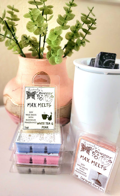 Indulge yourself in our reinvented formula of our wax melts. We call them "max melts" because we have placed the maximum amount of allowed fragrance oil to give you the ultimate room filled experience. That means each squared piece will last longer in the air and will bring each space its own unique aroma. Check them out!